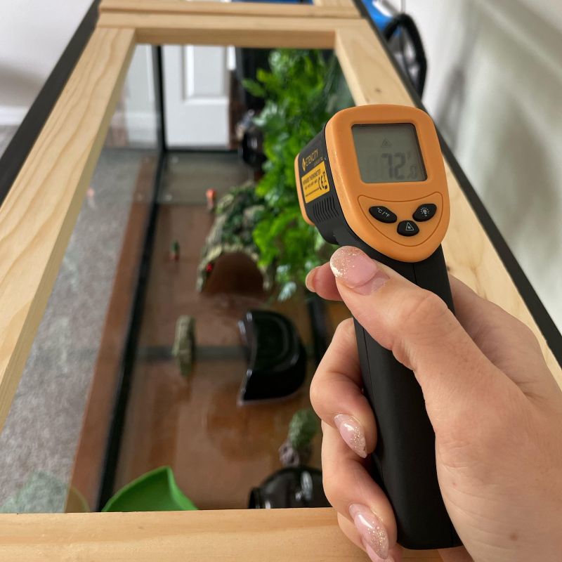 Skip the large, stick-on, plastic thermometers. They’re notoriously inaccurate and only read one spot. Instead, every reptile keeper should have an infrared temp gun. They’re more reliable and let you check temperatures anywhere in the enclosure.